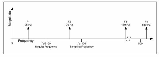 圖3給出了一個(gè)例子。假設(shè)采樣頻率fs是100HZ,,信號中含有25、70、160、和510 Hz的成分。