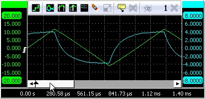 滾動(dòng)條的寬度表示總的測(cè)量記錄,滑塊的寬度表示記錄的可見(jiàn)部分。要更改記錄視圖偏移量,請(qǐng)抓取滑塊并將其拖動(dòng)到首選位置(動(dòng)畫(huà)3)或按下滾動(dòng)條兩側(cè)的按鈕。要更改記錄視圖增益,請(qǐng)將滑塊的邊緣之一向左或向右拖動(dòng)并觀察與滑塊寬度相對(duì)應(yīng)的信號(hào)變化(動(dòng)畫(huà)4)。