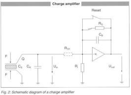 大部分電荷放大器有多個(gè)測(cè)試范圍。測(cè)試范圍的選擇是由開關(guān)電容CB決定的。放大器輸出是10V的信號(hào),因此可以作寬靈敏度和寬測(cè)試范圍的傳感器單信號(hào)電荷放大器使用。電荷放大器的精度主要取決於電容CB的容限。電荷放大器有非常好的±0.05FS的線性度。當(dāng)校正整個(gè)測(cè)試鏈或調(diào)整放大器和傳感器時(shí),電荷放大器的錯(cuò)誤可以忽略不記。在規(guī)格限定內(nèi),電荷放大器是有過(guò)載限定的。過(guò)載參數(shù)由信號(hào)回轉(zhuǎn)率和電荷數(shù)量確定。J-FET放大器在不適當(dāng)?shù)膫鞲衅鬟B接時(shí)比MOS-FET對(duì)靜電放電更加敏感,但其有相當(dāng)大的偏差和溫度依靠性。