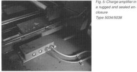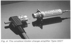 小型化Hybird技術(shù)使實(shí)際的電荷放大器變的更小更緊湊,他們能被非常近地裝在測(cè)試地點(diǎn)。直接放在機(jī)器上,因此縮短了傳感器和放大器之間的距離。Hybird技術(shù)也有安裝范圍。然而,可變測(cè)試范圍通過(guò)積分電壓放大器的方法來(lái)調(diào)節(jié)。當(dāng)前最小的電荷放大器Type 5027(Fig.4)只有45mm×16mm,有3個(gè)測(cè)試范圍。