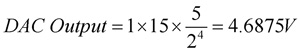 當(dāng)DIN為1111時,數(shù)字模擬轉(zhuǎn)換器的輸出如方程式3所示。由此可知本范例中的最大輸出值為低于電壓參考(5伏特)一個LSB(0.3125伏特)的值。