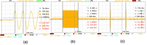用信號(hào)產(chǎn)生器產(chǎn)生一個(gè)FSK信號(hào),調(diào)制脈沖信號(hào)的周期設(shè)為2秒,占空比為0.1%(即瞬時(shí)信號(hào)持續(xù)2毫秒,載波信號(hào)頻率設(shè)為2MHz的正弦,在示波器上可以看到信號(hào)的時(shí)域波形如圖2所示。圖2(a)(b)(c)三個(gè)圖是在不同大小的時(shí)基下觀察到的信號(hào)波形,從圖中不難理解這種類似TPMS工作信號(hào)的長間隔、高頻率、瞬時(shí)特性,類似這樣的信號(hào),在無線傳感器、無線射頻辨識(shí)系統(tǒng)(RFID)等許多領(lǐng)域都很常見。