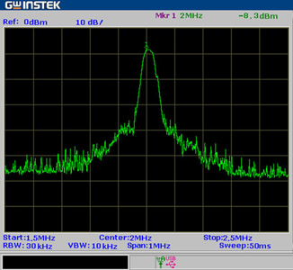 測量信號(hào)頻率時(shí),可以打開峰值保持,將中心頻率設(shè)在2MHz。頻率跨度的選擇須考慮與解析頻寬(RBW)的搭配,若測量范圍(SPAN)和RBW相差很大,加上信號(hào)擷取困難,測得頻率所需時(shí)間會(huì)非常長;若SPAN和RBW相差很小,則容易造成頻率測量不準(zhǔn)確??蛇x擇30kHz的RBW和1MHz的SPAN,在這種情況下,頻譜分析儀不能保證對(duì)每一個(gè)瞬時(shí)信號(hào)都能成功擷取,所以在頻譜分析儀上看到的頻譜變化間隔往往大于2秒,這是由于SPAN大于RBW時(shí),若信號(hào)進(jìn)入頻譜分析儀時(shí)其實(shí)時(shí)掃描的頻率偏離信號(hào)真實(shí)頻率,則信號(hào)將無法被擷取,但經(jīng)過稍長的一段時(shí)間(取決于SPAN和RBW之差)后,依然能在峰值保持的模式下觀察到信號(hào)累積的頻譜情況,根據(jù)此一圖像可輕易透過搜索峰值讀出信號(hào)頻譜中心點(diǎn)的頻率,精準(zhǔn)度可以達(dá)到kHz的級(jí)別,如圖3所示,測得信號(hào)頻率為2.0MHz。