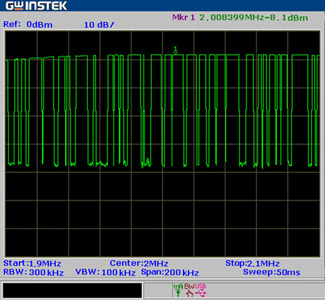 將FSK信號(hào)送進(jìn)頻譜分析儀后,按下自動(dòng)設(shè)定(Autoset)鍵,將發(fā)現(xiàn)信號(hào)很難擷?。淮蜷_峰值保持,也看不到信號(hào)擷取留下的波形,由于FSK信號(hào)難于擷取,一次性較精準(zhǔn)測得其頻率和功率有較大困難,因此先分別測量功率和頻率,從而較準(zhǔn)確地獲得信號(hào)的參數(shù)。