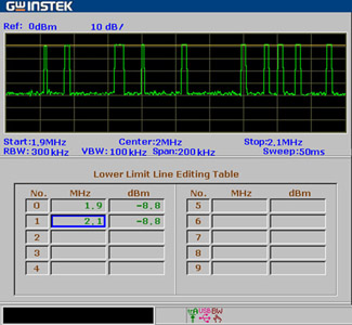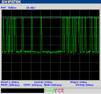 另外,可在頻譜分析儀上設(shè)置通過/失敗(Pass/Fail)的功率限制線(Limit Line),如圖5所示,使功率滿足限制范圍的信號(hào)(產(chǎn)品)通過。這一應(yīng)用只須在2.2.2的設(shè)置基礎(chǔ)上進(jìn)入限制線菜單進(jìn)行Pass/Fail功能設(shè)置即可,廠商分析儀產(chǎn)品限制線菜單的設(shè)置靈活,可以方便地編輯使用者須設(shè)定的功率上限和下限。限制線透過表格形式編輯在線的各點(diǎn),各點(diǎn)連成的限制曲線可滿足使用者在不同頻率點(diǎn)有不同功率標(biāo)準(zhǔn)的需要,而非簡單的直線,透過簡單幾個(gè)鍵的設(shè)置,頻譜分析儀即能幫助使用者將符合要求的信號(hào)判定為通過,而所有不符合要求的信號(hào)都將被準(zhǔn)確無誤地判定為失敗,圖6所示為通過測試時(shí)頻譜儀顯示的畫面。