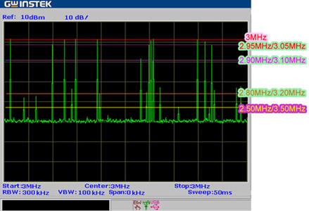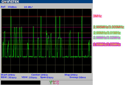 這種零SPAN的通過測試設(shè)置方法唯一有可能疏漏的信號(hào)是功率偏大,同時(shí)又有頻偏的信號(hào)。頻偏造成的擷取衰減若剛好將其功率過大的部分衰減到標(biāo)準(zhǔn)功率范圍,則會(huì)被測試判為通過,從而造成誤判,若能先用之前所述的單純測試功率方法判斷信號(hào)功率,再用零頻跨的方法判斷其頻率,這樣就能將所有在功率或頻率上不符合標(biāo)準(zhǔn)的信號(hào)全部被判為失敗,使通過測試高效而準(zhǔn)確。