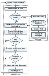 圖1顯示USB開(kāi)機(jī)管理程序的數(shù)據(jù)流。在開(kāi)機(jī)重新啟動(dòng)時(shí),開(kāi)機(jī)管理程序會(huì)計(jì)算使用者程序的檢查碼,并和儲(chǔ)存在內(nèi)存中的檢查碼進(jìn)行比對(duì)。這個(gè)檢查碼是現(xiàn)場(chǎng)可編程開(kāi)機(jī)管理程序的檢查碼模塊,若兩個(gè)數(shù)值相符,開(kāi)機(jī)管理程序就會(huì)讓處理器開(kāi)始執(zhí)行使用者的程序,但若檢查碼不一致,開(kāi)機(jī)管理程序就會(huì)讓主機(jī)等候分送新的使用者程序代碼。在準(zhǔn)備階段,開(kāi)機(jī)管理程序會(huì)關(guān)閉任何可能干擾下載流程的岔斷,在某些系統(tǒng)中,微控制器可能須處理一些重要作業(yè),然后再開(kāi)始下載,如可能必須啟動(dòng)散熱風(fēng)扇或讓某些發(fā)光二極管(LED)燈號(hào)閃動(dòng),由于應(yīng)用程序的空間是被刪除的目標(biāo),因此如散熱風(fēng)扇或LED燈號(hào)的控制例程等這類關(guān)鍵作業(yè)須寫(xiě)入開(kāi)機(jī)管理程序。
