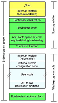 第三組則是供使用者程序使用,這個(gè)部分含有使用者程序代碼、所有相關(guān)的岔斷向量及呼叫開(kāi)機(jī)管理程序的例程,這個(gè)區(qū)域可重新編程與重新尋址,但在開(kāi)機(jī)管理程序下載程序代碼時(shí)無(wú)法被存取。任何指向此區(qū)域的岔斷,在呼叫任何開(kāi)機(jī)管理程序函式之前都應(yīng)關(guān)閉,若在執(zhí)行時(shí)程序內(nèi)容會(huì)變更,則應(yīng)考慮可能發(fā)生的各種問(wèn)題。