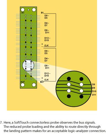 現(xiàn)在考慮一個替代方案,即采用E5390A軟接觸無連接器探頭。此時可將信號連接到探測點的測試焊盤(見圖7),這意味著不會給系統(tǒng)增加額外的走線電容。該探頭的網(wǎng)絡(luò)電容為0.7 pF,通過采用這種連接,可在不導(dǎo)致系統(tǒng)失效的情況下進行邏輯分析。
