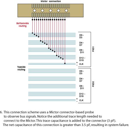 使用錯誤的連接方法 假設(shè)用邏輯分析儀觀察一個系統(tǒng)的PCB上兩個器件之間的信號。該信號走線布在PCB表層,若負載超過3.5pF,則會導(dǎo)致系統(tǒng)失效。設(shè)計工程師利用基于Mictor連接器的探頭E5380A來觀察信號。 由于連接器的管腳分布和結(jié)構(gòu),信號不能用過它直接連接。這迫使設(shè)計工程師將連接器放在走線層,并對每個信號增加過孔。于是,對連接器的走線連接利用另外一層PCB層完成,其走線方向與原始信號的走線垂直。圖6顯示了該連接器的布線圖。