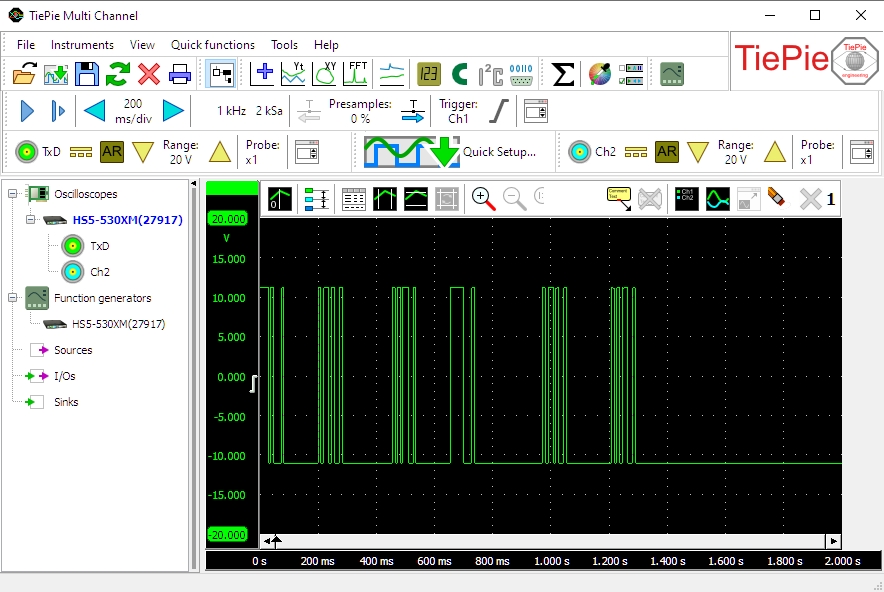 TiePie 工程多通道示波器軟件能夠使用UART/串行解碼器分析 RS232 信號(hào)。
