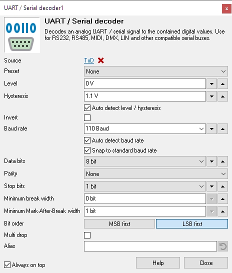 對于正常的串行通信,所有高于Level的信號(hào)電平都被認(rèn)為是邏輯“0”,所有低于Level - Hysteresis的信號(hào)電平都被認(rèn)為是邏輯“1”。解碼器可以根據(jù)測量數(shù)據(jù)檢測電平和遲滯,或者用戶可以設(shè)置將用作電平和遲滯的電壓。通常,Auto level 和 hysteresis 都可以,因此啟用Auto detect level / hysteresis。
