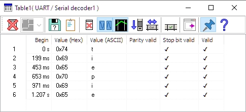 在我們的示例中,“tiepie”一詞由串行解碼器輸入、測量和轉(zhuǎn)換。解碼后的信息如表所示。