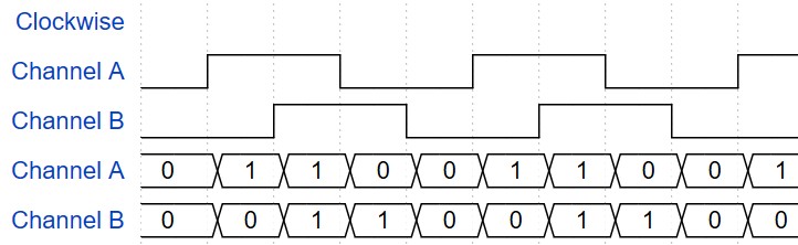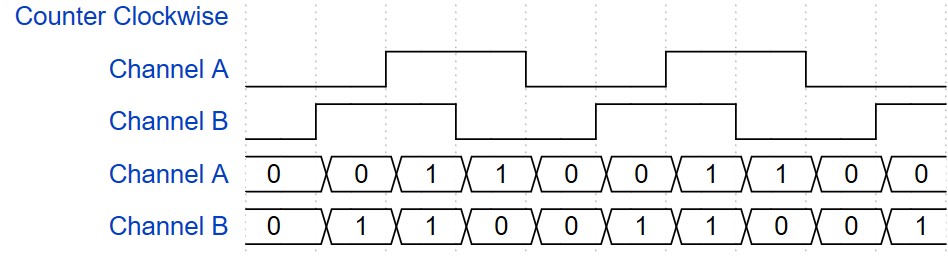 增量編碼器通常以兩個數(shù)字信號的形式輸出數(shù)據(jù),以指示位置和旋轉(zhuǎn)方向,該數(shù)字波形看起來像兩個相位相差 90 度的方波,如下圖所示。輸出這些信號的增量編碼器有時被稱為正交編碼器。在光學(xué)編碼器的情況下,這是通過使用 LED、圖案盤和高速光電傳感器來實(shí)現(xiàn)的。當(dāng)編碼器轉(zhuǎn)動時,帶圖案的圓盤要么允許來自 LED 的光穿過光電傳感器,要么被阻擋。這會產(chǎn)生所需的方波行為。圓盤有兩個相位相差 90 度的圖案,這會產(chǎn)生兩個異相方波。通過識別哪個方波領(lǐng)先另一個方波,