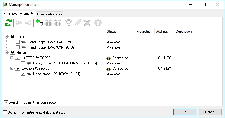 使用帶有以太網(wǎng)連接(LAN、WiFi 或 WAN)的 Handyscope 系列示波器進(jìn)行遠(yuǎn)程測量非常透明,以致于看起來連接以太網(wǎng)的儀器直接連接到 PC。多通道示波器軟件默認(rèn)支持以太網(wǎng)連接的儀器。示波器、頻譜分析儀、數(shù)據(jù)記錄器和電壓表的所有軟件和硬件功能仍可通過網(wǎng)絡(luò)使用。不需要特定的網(wǎng)絡(luò)知識(shí)??捎脙x器的對(duì)話框顯示網(wǎng)絡(luò)儀器。只需打勾,即可開始測量。 TiePie 的工程格言再次適用:即插即測 示波器