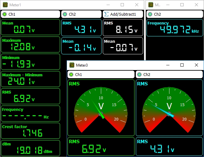 萬用表是一種對(duì)信號(hào)執(zhí)行測量,然后確定該信號(hào)的一個(gè)或多個(gè)特定屬性并將這些屬性顯示為數(shù)值的儀器。 萬用表可用于測量或監(jiān)視信號(hào)的特定屬性,如 RMS 值、頻率、最大值等。多通道示波器軟件可以具有任意數(shù)量的完全可配置的顯示,可以將測量值顯示為數(shù)字或使用儀表顯示。使用儀表顯示時(shí),它在針對(duì)特定屬性調(diào)整電路時(shí)非常有用,例如將偏移量調(diào)整為零。 任意波形發(fā)生器