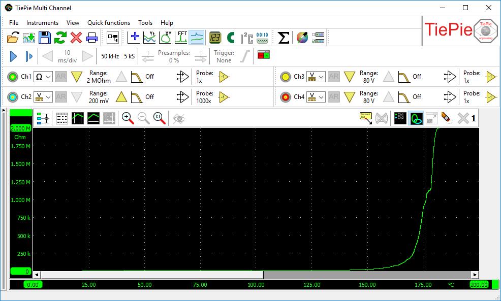 創(chuàng)建 NTC 和 PTC 等特殊電阻器的電阻圖。例如,使用通道 1 測(cè)量 PTC 的電阻,使用通道 2 測(cè)量溫度。然后,XY 圖將顯示作為溫度函數(shù)的電阻變化。