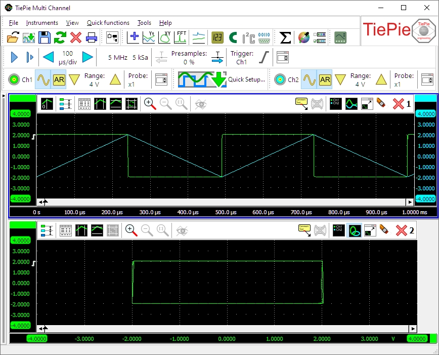 在我們的示例中,我們使用函數(shù)生成器來(lái)生成兩個(gè)信號(hào)。兩者都產(chǎn)生-2到+2V信號(hào).一個(gè)是方波,另一個(gè)是三角波。
