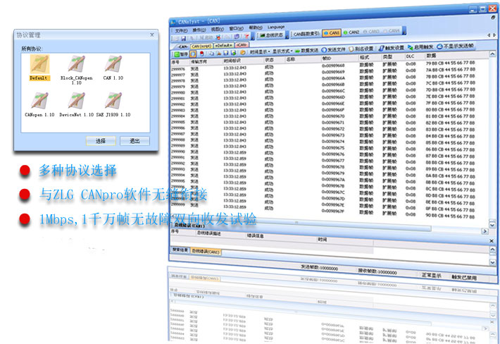 分析儀軟件兼容ZLG“CANPro協(xié)議分析平臺V1.45”、兼容“CAN通訊測試工具ZLGCANTest”及
