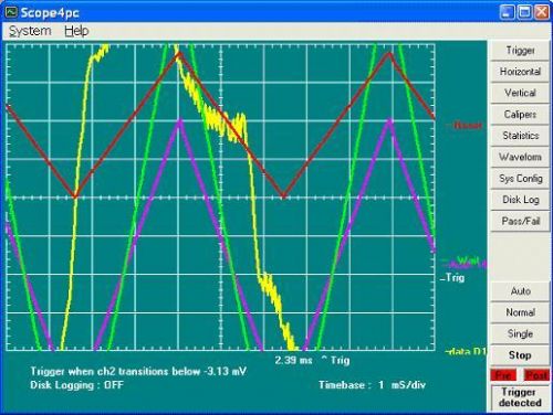 型號(hào):(是一款標(biāo)準(zhǔn)的多通道測(cè)量基于PC數(shù)字存儲(chǔ)示波器.(通過USB連接臺(tái)式機(jī)或筆記本電腦) 標(biāo)準(zhǔn)的設(shè)計(jì)使儀器很容易擴(kuò)展到 4 到 64 通道 (每個(gè)USB能連接8 個(gè)通道). 便攜式高性能基于PC的示波器能完成瞬態(tài)捕捉,和捕捉數(shù)據(jù)到計(jì)算機(jī). 這最新一代Scope4pc示波器,每通道有可調(diào)節(jié)的 256K存儲(chǔ)深度, 采樣速率在觸發(fā)前或觸發(fā)后能調(diào)節(jié)到最佳位置, 在捕捉數(shù)據(jù)時(shí)有很大彈性,用縮放功能即使在高速采樣時(shí)也能觀察細(xì)節(jié),諸如毛刺和瞬態(tài)記錄. 示波器不但包含采樣而且有復(fù)雜的觸發(fā)選項(xiàng),用通道1~~4 或外觸發(fā)輸入作為觸發(fā)源, 復(fù)雜的觸發(fā)特性提高了脈沖捕捉能力, 脈沖寬度觸發(fā),窄脈沖觸發(fā),脈沖記數(shù),脈沖記數(shù)和最小脈沖,示波器可用單通道或多通道作為同步觸發(fā)源,所有標(biāo)準(zhǔn)模塊都是通過運(yùn)行在PC機(jī)里的軟件來控制的, 允許用戶使所有通道同步捕捉數(shù)據(jù).