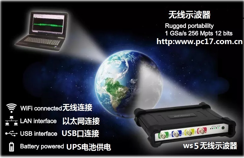 WS5 無(wú)線示波器優(yōu)點(diǎn):1.用WiFi和內(nèi)置電池, UPS不間斷電源,進(jìn)行無(wú)線測(cè)量2.可進(jìn)行移動(dòng)測(cè)量,例如在運(yùn)輸系統(tǒng)或移動(dòng)裝置上3.利用網(wǎng)絡(luò)和互聯(lián)網(wǎng)可進(jìn)行遠(yuǎn)程測(cè)量4.通過(guò)WiFi、網(wǎng)絡(luò)、互聯(lián)網(wǎng)和USB接口進(jìn)行連續(xù)現(xiàn)場(chǎng)測(cè)量5.電流隔離測(cè)量,無(wú)需與PC進(jìn)行物理連接6.可單獨(dú)應(yīng)用USB3.0總線進(jìn)行測(cè)量和高達(dá)200 MSa/s的實(shí)時(shí)高速瞬態(tài)記錄7.輕松完成WiFi安裝,點(diǎn)擊幾下鼠標(biāo),連接現(xiàn)有的WiFi網(wǎng)絡(luò)熱點(diǎn)自動(dòng)尋找現(xiàn)有網(wǎng)絡(luò),無(wú)需輸入IP地址8.帶有多種示例的SDK,C、C++ C# MathLAB、Labview可方便地將WiFiScope集成到其他應(yīng)用程序中9.網(wǎng)絡(luò)連接(WiFi和LAN)可在世界各地任意進(jìn)行測(cè)量8.快速設(shè)置每種測(cè)量類型9.連續(xù)記錄采集的數(shù)據(jù),直到硬盤(pán)滿為止10.SafeGround功能保護(hù)測(cè)量對(duì)象安全接地 11.CMI接口線可連接多臺(tái)儀器組成多通道采集卡,最多256個(gè)通道