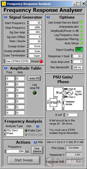 CS320A-FRA頻率特性分析儀是一款高性價(jià)比的頻率特性分析儀,由新西蘭CleverScope公司提供,CleverScope公司以其虛擬示波器而著名于世。CS320A-FRA其本身就是一款USB2.0數(shù)字示波器,10位ADC,100MSa/s采樣速率,2個(gè)模擬通道,外部觸發(fā),4M存儲(chǔ)深度,用于兩個(gè)模擬通道及外觸發(fā)通道。標(biāo)配CS701內(nèi)置隔離信號(hào)發(fā)生器-(1mHz-65MHz,可以產(chǎn)生正弦波信號(hào)),不需要額外增加外部隔離變壓器就可以進(jìn)行頻率響應(yīng)分析。配有CS300分析軟件包及2組CS1001 探頭組,前面板接地通過USB接口連接到PC。