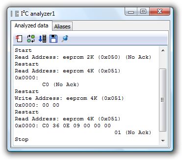 The I2C analyzer uses the SDA and SCL signals from the I2C bus and translates these into a chronologic list of all instructions including their data. The I2C analyzer has the following features: