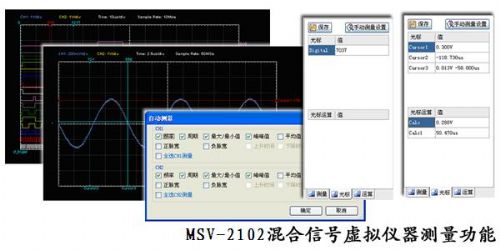 MSV-2102的數(shù)字示波器提供200MSa/s實(shí)時采樣,60M帶寬,每通道512k深度,以及邊沿、斜率、脈寬、交替、外觸發(fā)等多種觸發(fā)方式。邏輯分析儀100MSa/s實(shí)時采樣,100M帶寬,存儲256k,電平0-5V可調(diào),并提供了總線分析、分組測量、邏輯量測量、時間測量等。