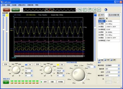 MSV-2102的數(shù)字示波器部分提供200MSa/s實(shí)時采樣,60M模擬帶寬,每通道512k采樣點(diǎn)存儲深度,以及邊沿、斜率、脈寬、交替、外觸發(fā)等多種觸發(fā)方式。邏輯分析儀部分提供100MSa/s實(shí)時采樣,100M測量帶寬,存儲深度達(dá)256k字,測量電平0-5V可調(diào),并提供了總線分析、分組測量、邏輯量測量、時間測量等多種多樣的測量方式。儀器使用全速速USB2.0接口與計(jì)算機(jī)通訊。