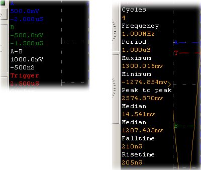 Standard waveform measurements are included and can be displayed on the screen right next to the traces.