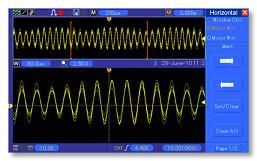 手動(dòng)模式:光標(biāo)間的電壓差△V; 光標(biāo)間的時(shí)間差△T; △T的倒數(shù),以Hz為單位(1/△T)