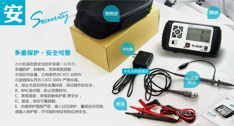 K-125系列手持式數(shù)字示波表是一款便攜式的波形測(cè)量工具。替代模擬示波器和臺(tái)式的數(shù)字示波器以及數(shù)字萬用表,在現(xiàn)場(chǎng)和教學(xué)等領(lǐng)域是最好的觀測(cè)工具。它采用高速AD采樣器,把被測(cè)輸入的模擬信號(hào)轉(zhuǎn)換為數(shù)字信號(hào)經(jīng)過高速CPU的處理顯示在128*64的LCD屏上。高速比較器,獲得良好的邊沿觸發(fā),穩(wěn)定的顯示便于觀測(cè)。萬用表采用6000計(jì)數(shù)的高精度專用芯片,精度更高。配備大容量鋰電池,節(jié)能設(shè)計(jì)使本機(jī)充電一次可以工作10小時(shí)以上。充電器采用標(biāo)準(zhǔn)的手機(jī)充電器,讓你在任何地方都可以方面使用。