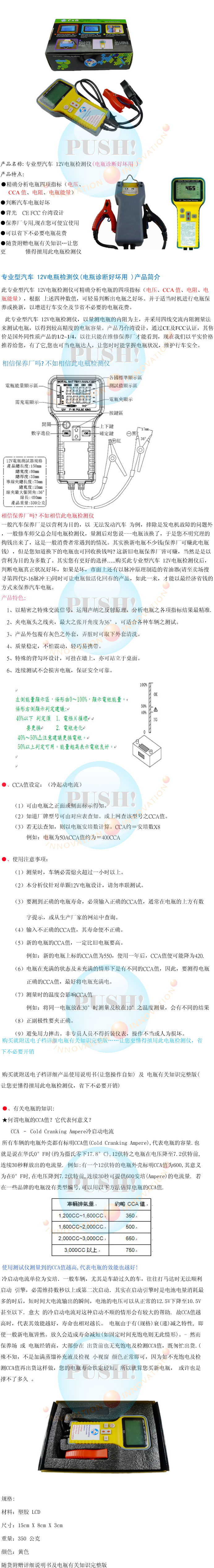 產(chǎn)品簡介: 電壓 CCA值 電阻 電瓶能量檢測,12V汽車電平檢測。通過CE及FCC認(rèn)證。