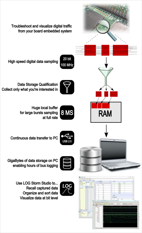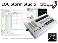 LOG Storm is a high-speed data logger used for recording activity from embedded electronic system digital bus and data lines.  Record during hours and days.  Extract specific events from bus traffic.