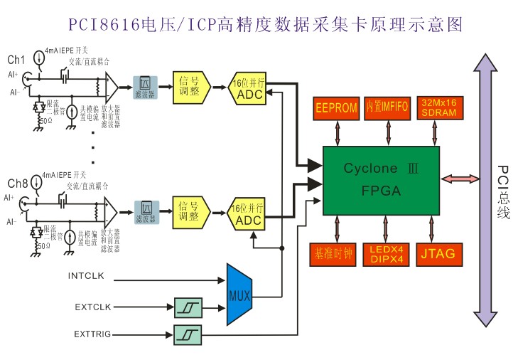 PCI8616:同步8Ch16Bits1Msps帶ICP功能高精度數(shù)據(jù)采集卡