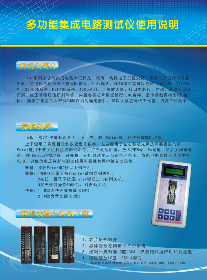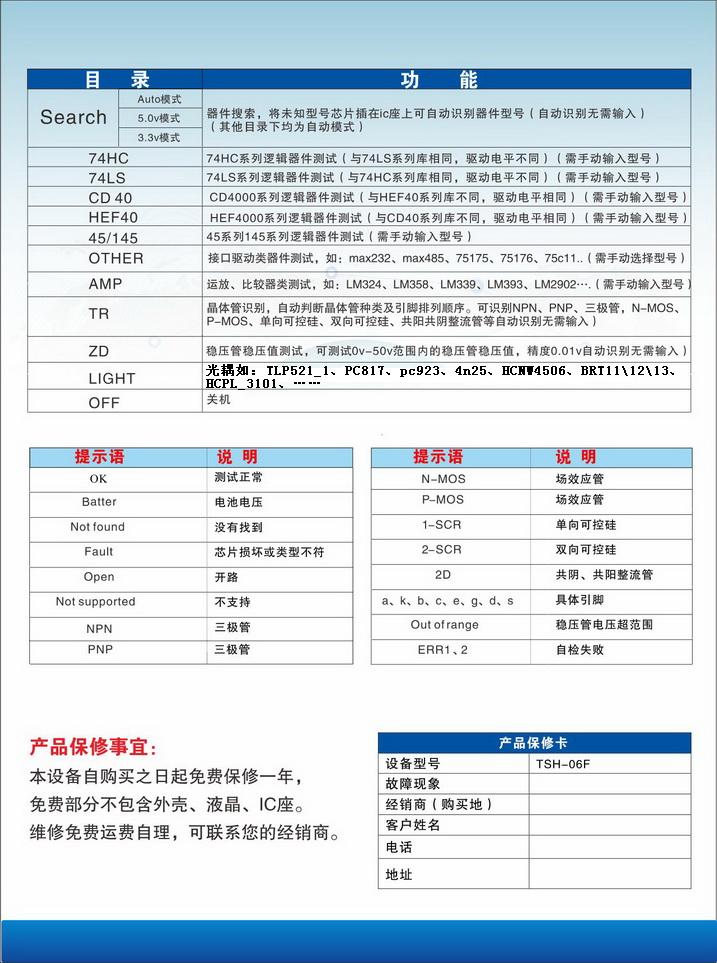 可以測試74ch系列、74ls 系列、CD4000系列、HEF400系列、4500系列、運算放大器、接口類芯片、光耦、晶體管自動識別、穩(wěn)壓管穩(wěn)壓值識別等等。內(nèi)置各類芯片數(shù)據(jù)模型 1300余種、晶體管數(shù)據(jù)模型420余種, 涵蓋了常見的大部分24腳以內(nèi)的器件